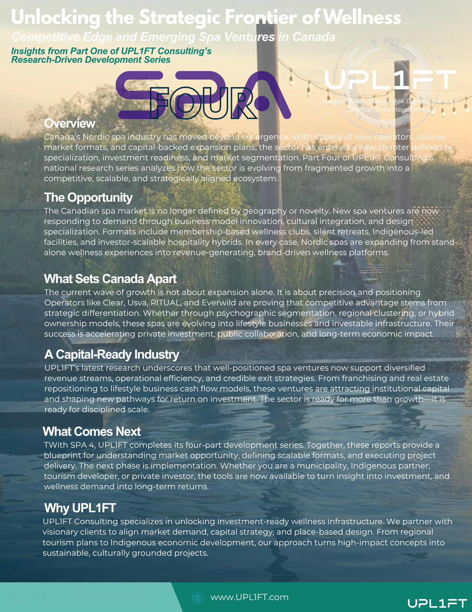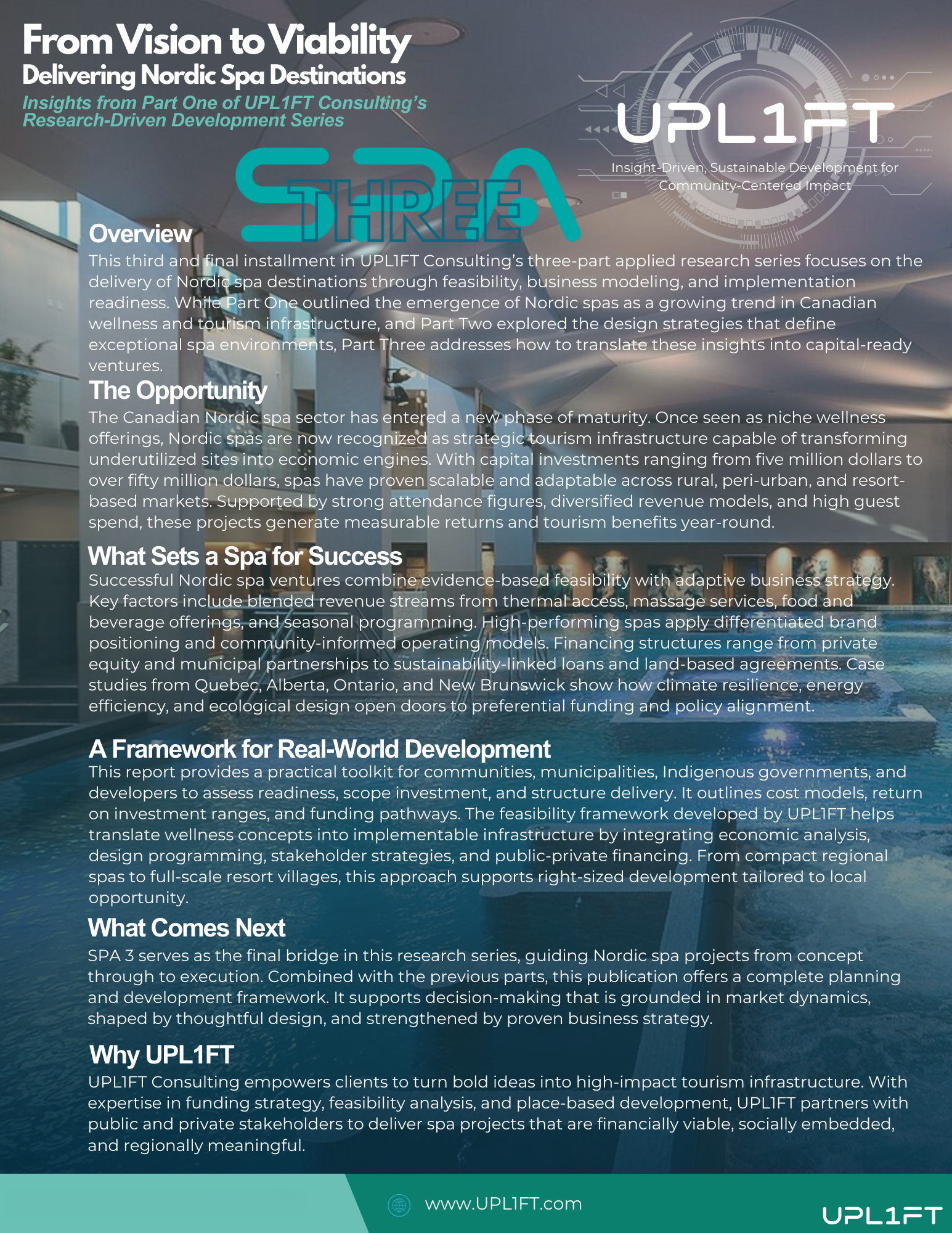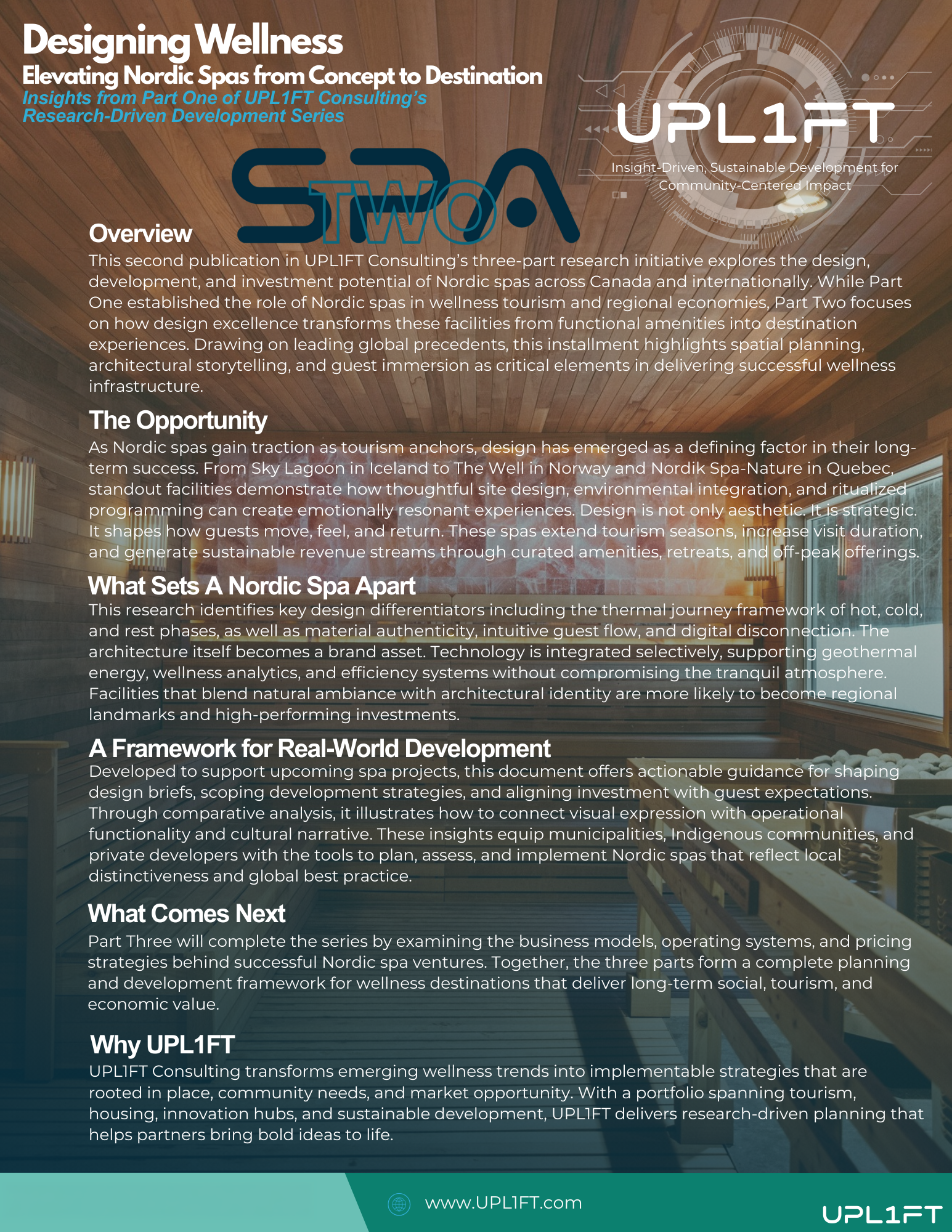 This market intelligence framework has been applied by UPL1FT in live development and investment contexts to support feasibility testing, market sizing, and program definition for Nordic spa and wellness-led projects in Canada.